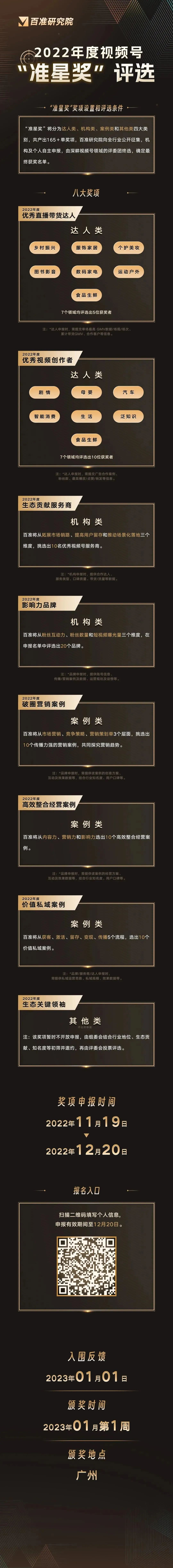 入围者将有机会获得百准及合作伙伴的全渠道传播曝光机会,具有代表性获奖者将有机会成为百准研究院《2023年视频号商业生态研究报告》标杆案例。