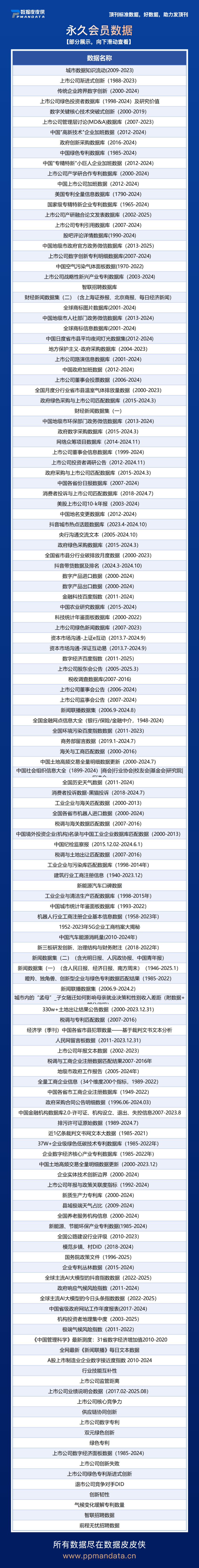 CNPaperData(简称CNPD)是立足大规模数据采集、清洗、挖掘的国家高新技术企业,借鉴Compustat、WRDS等国际知名数据库及FT50期刊专业标准,打造中国特色经济管理社会科学研究型数据库。涵盖上市公司、企业、省份、地级市、县域、高校、人物等研究对象,涵盖经济、法律、金融、政策、科技、文化、健康、环保、人口等各类热门数据。顶刊标准数据,好数据助力发好刊!获取数据地址https://www.ppmandata.cn/trade/list