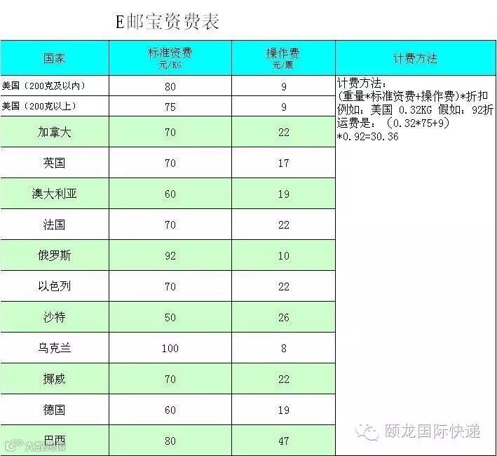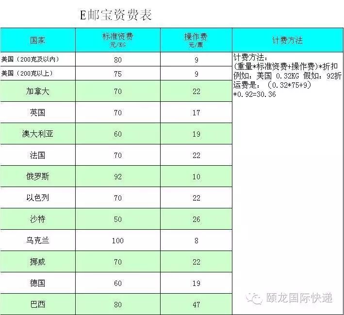 1、E邮宝原价跟挂号小包相当,个别国家(美国)甚至更低,颐龙专业提供E邮宝服务,折扣低至8折左右。原价表如图,请参考: