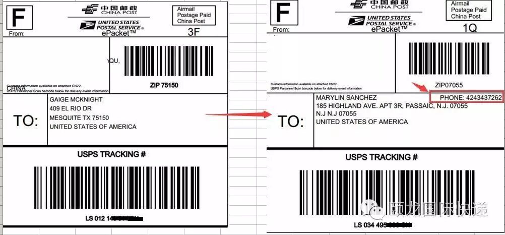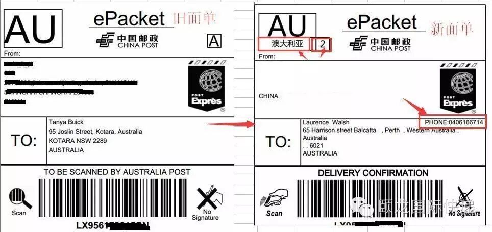 3、邮局不断改善,时时创新,提高E邮宝的质量。7月6日,邮局进一步改善面单,在主面单上:1)增加中文国名,防止货物发错;2)增加收件人电话,提高签收率;3)增加分拣码,提高时效。颐龙系统直接对接邮局系统,第一时间获得更新,方便电商客户直接下单打单!以下为新老面单对比图: