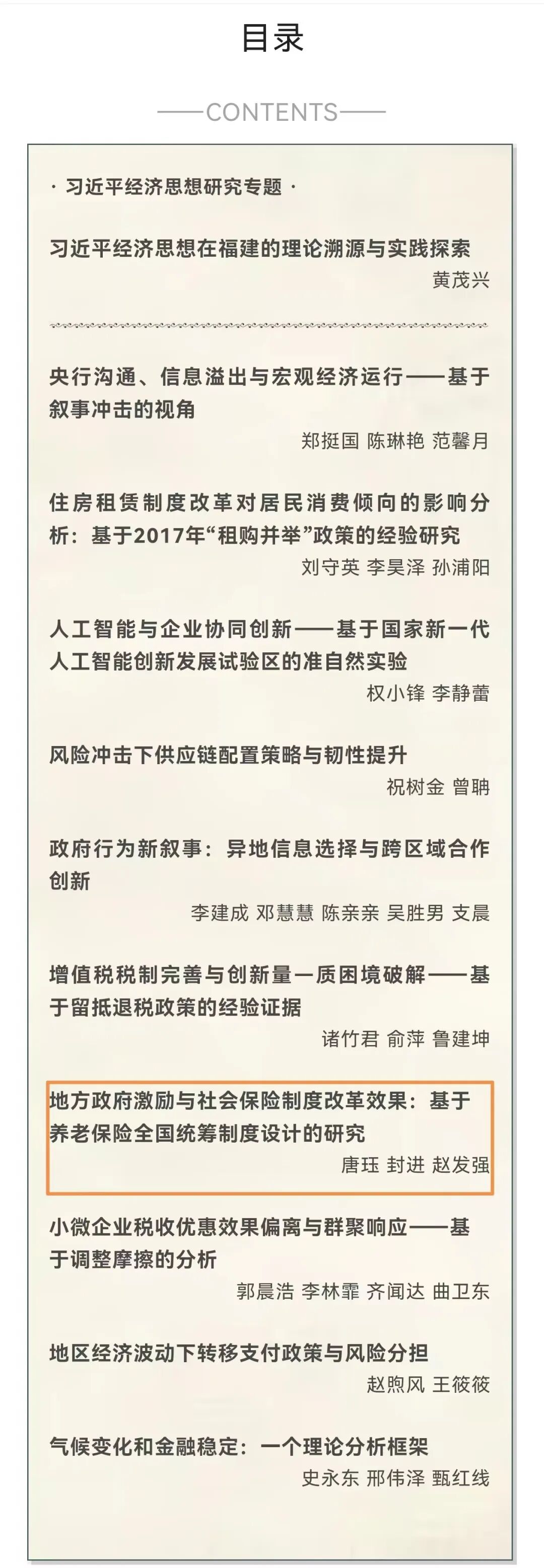 据上海财经大学科研处官方公众号显示,由上海财经大学公共管理学院唐珏副教授和复旦大学封进教授、复旦大学博士后赵发强合作撰写的《地方政府激励与社保改革效果:基于养老保险全国统筹制度设计的研究》发表于《经济研究》2025年第8期。