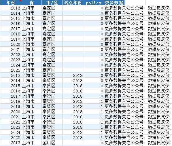 本数据以社区居家养老服务改革试点为背景,旨在构建一个适用于多期双重差分(DID)模型的虚拟变量“Policy”,用于评估社区居家养老政策对老年家庭数字消费等经济社会指标的政策效应。社区居家养老是中共中央、国务院为应对人口老龄化、构建多层次养老服务体系而实施的重要举措。本变量通过识别试点政策在特定年份是否在特定城市实施,为实证研究提供准自然实验框架下的政策冲击指标,尤其适用于分析养老政策对家庭消费行为、老年人福利等微观经济指标的影响。