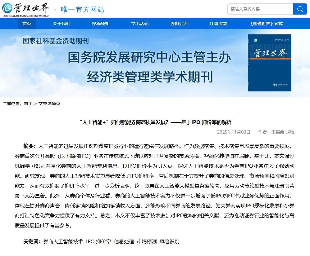 据中南大会计学院官方公众号消息,该院博士研究生赵牧与王嘉鑫副教授合作的论文《“人工智能+”如何赋能券商高质量发展?——基于IPO抑价率的解释》在管理学权威学术期刊《管理世界》2025年第11期公开发表。