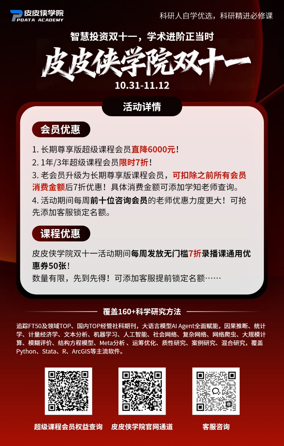 皮皮侠学院追踪FT50及领域TOP、国内TOP经管社科期刊,大语言模型Al Agent全面赋能,因果推断、统计学、计量经济学、文本分析、机器学习、人工智能、社会网络、复杂网络、网络爬虫、大规模计算、模糊评价、结构方程模型、Meta分析 、运筹优化、质性研究、案例研究、混合研究,覆盖Python、Stata、R、ArcGIS等主流软件,已服务超过上万名高校师生,欢迎报名新课及定制化培训!