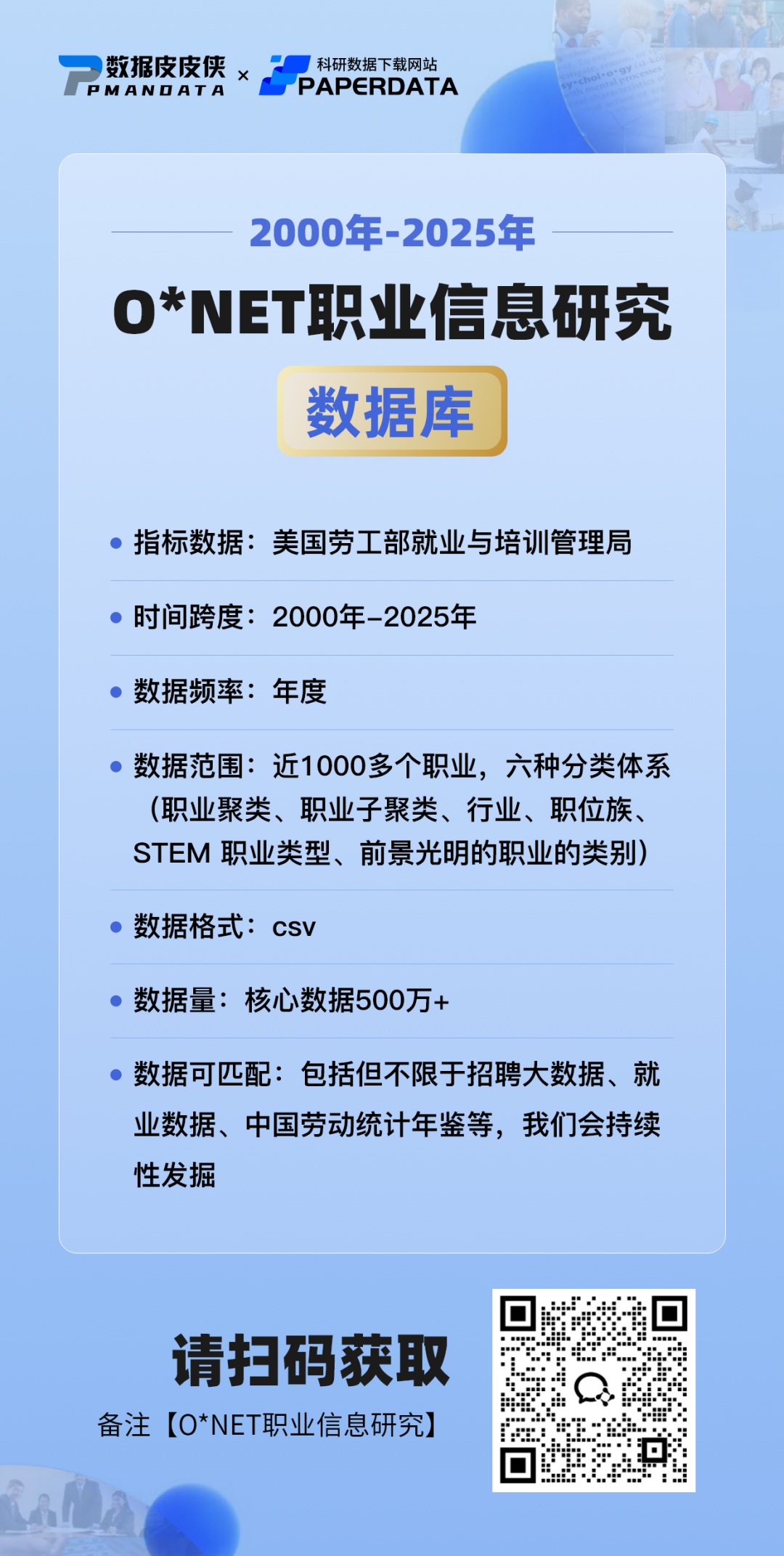 在经学者专家们反映的有关科研需求后,数据皮皮侠团队联手CNPD数据团队一起引入并整理开发了O*NET美国职业信息网络数据库,历经两个月,对历年所出版的版本(共计60版,2000年-2025年)通过人工调研进行分类处理和开发,并采用设定好的数据处理管道还有大语言模型,进行最终翻译与整理,统共分为中英文版本,以方便您的研究。