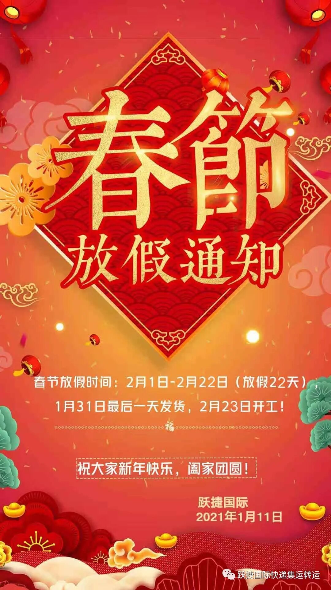 1月31日空运和海运最后一天发货,空运货物放假前发出春节前都可以收到货。
