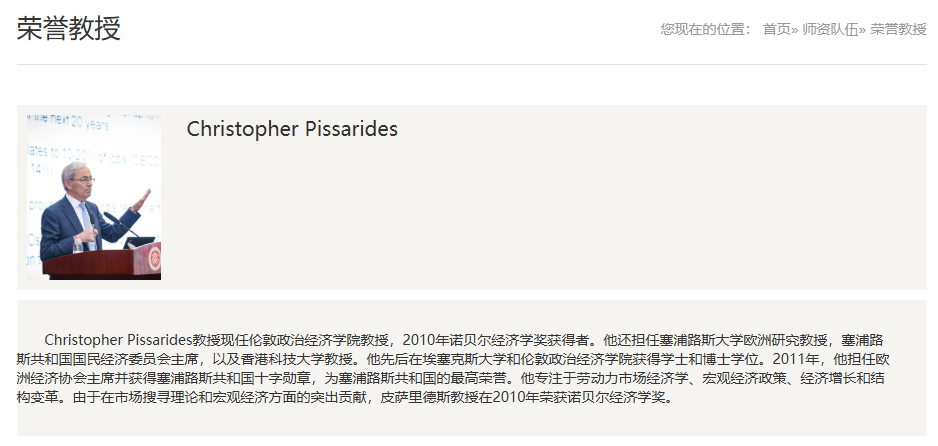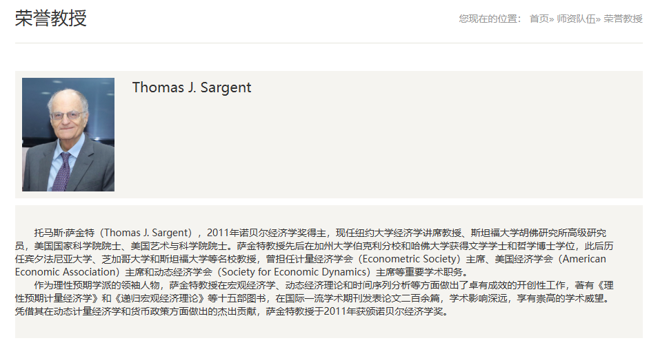 此外,北京大学曾聘请多位诺奖得主为名誉教授,包括2011年诺贝尔经济学奖得主Thomas J. Sargent、2010年诺贝尔经济学奖获得者Christopher Pissarides、2004年诺贝尔经济学奖获得者Finn Kydland、2000年诺贝尔经济学奖得主James. J Heckman、1998年诺贝尔经济学奖得主Amartya Sen。