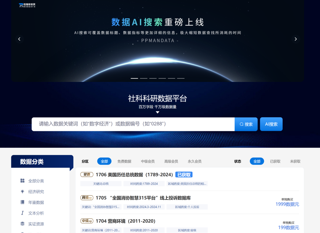 数据皮皮侠借鉴Compustat、WRDS等国际知名数据库及FT50期刊专业标准,打造中国特色经济管理社会科学研究型数据库。涵盖上市公司、企业、省份、地级市、县域、高校、人物等研究对象,涵盖经济、法律、金融、政策、科技、文化、健康、环保、人口等各类热门数据。如今已拥有上百亿数据量、数百万字段的超大型数据库。顶刊标准数据,好数据助力发好刊!获取数据地址https://www.ppmandata.cn/trade/list