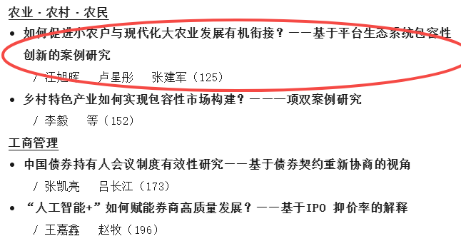 据管理世界杂志官方公众号显示,东北财经大学工商管理学院博士研究生卢星彤、张建军和该院教授汪旭晖合作完成的学术论文《如何促进小农户与现代化大农业发展有机衔接?——基于平台生态系统包容性创新的案例研究》在《管理世界》2025年第11期刊出。