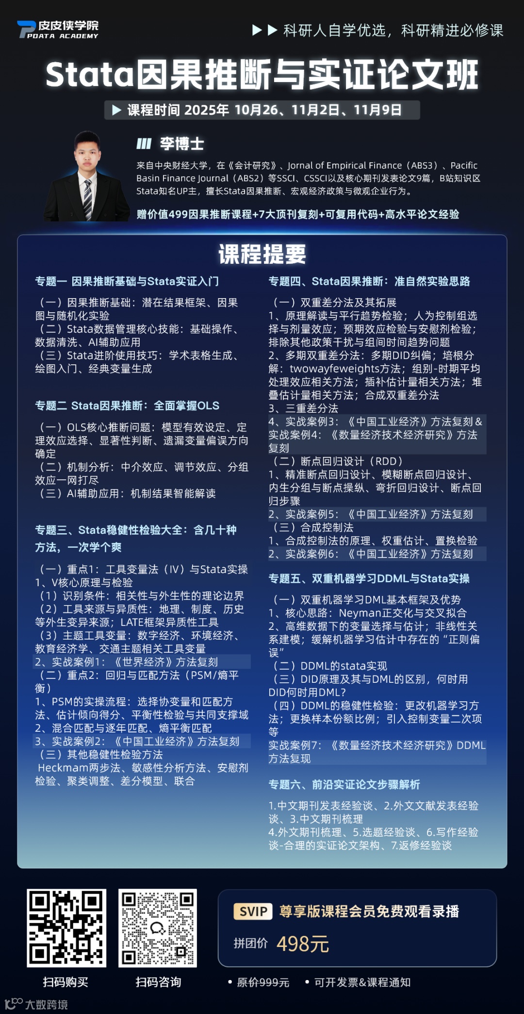 本课程旨在帮助学员快速、系统地掌握常见因果推断方法,并应用于论文写作与发表。课程精选会计、金融、经济、社会学等人文社科领域近10篇经典论文,深入讲解Stata实证入门、OLS与IV因果框架、十余种稳健性检验方法,以及DID、RDD、SCM等准自然实验思路,并分享高水平论文的写作经验。所有内容均含理论解析与可操作的Stata代码。