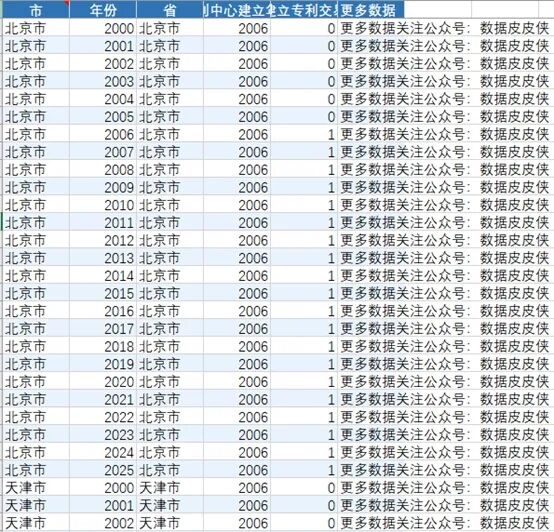本团队参考Han等(2020)发布在《Management Science》上的文章,基于国家知识产权局公布的专利交易中心名单及建立时间,构建了一套完整的DID变量体系。城市专利交易中心名单为:https://www.cnipa.gov.cn/art/2016/6/2/art_392_48642.html该体系包含两个核心变量:,“专利中心建立年份”“是否专利交易中心建立之后的年份”。数据覆盖全国主要地级市,时间跨度为2000年至2025年,其中2006年起部分城市开始建立专利交易中心。本数据适用于开展动态DID、事件研究等实证分析,为理解专利交易中心建设的政策效果提供可靠的识别基础。