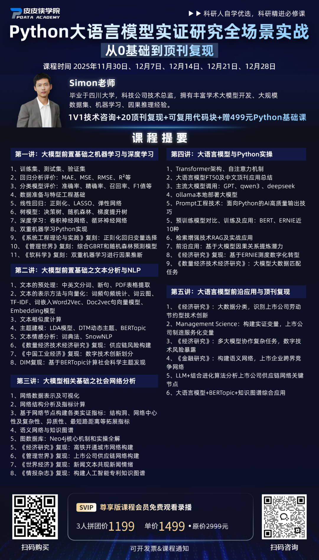 课程名称:Python大语言模型实证研究全场景实战——从0基础到顶刊复现