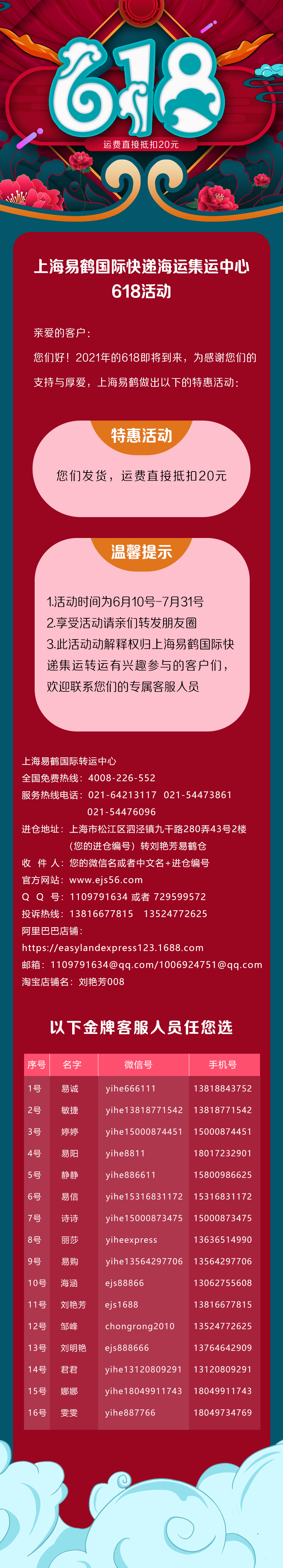 导读:上海易鹤集运转运2021年618特惠,发货直接抵扣运费20元