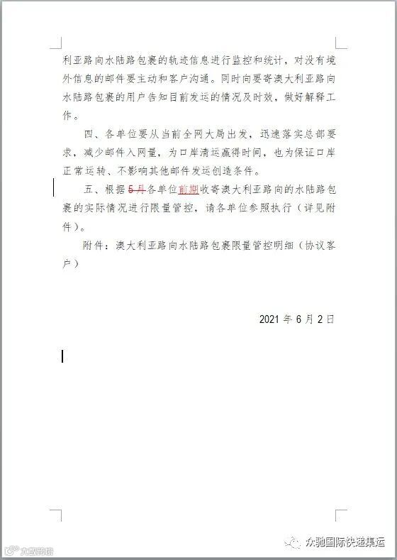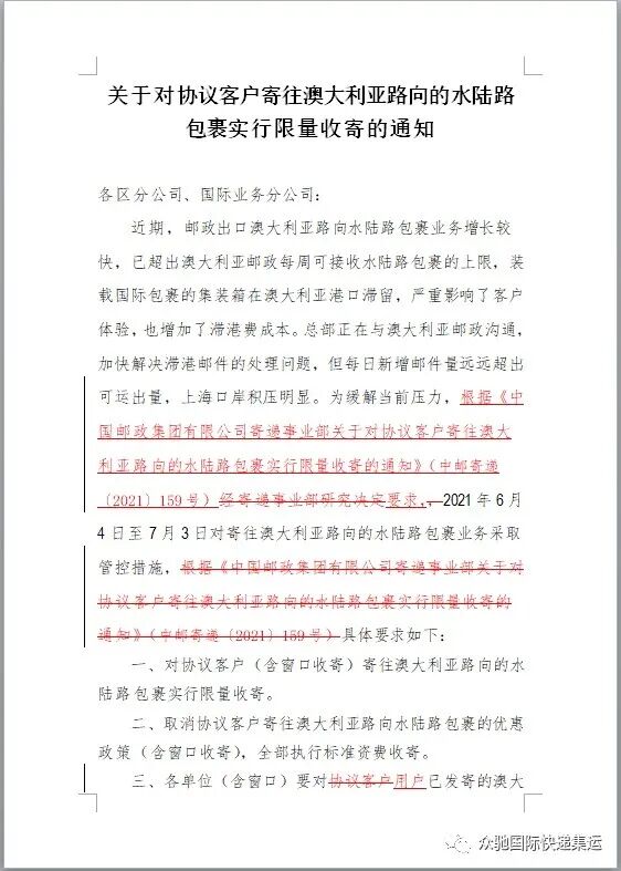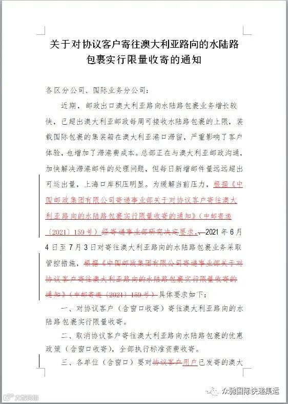 由于受澳洲邮政系统接受海运包裹的上限及上海港口拥堵等影响,中国邮政官方对寄往澳大利亚新西兰方向海运实行管控。