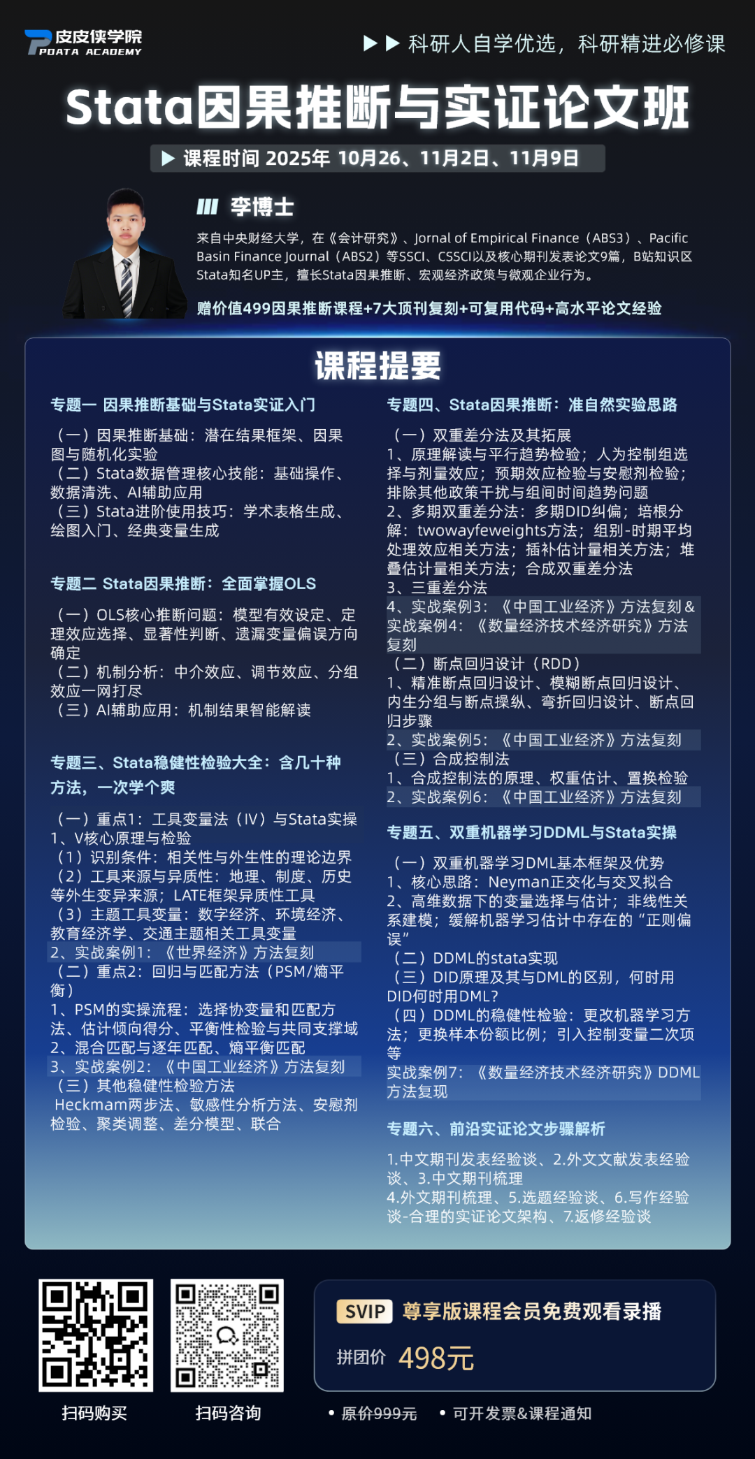 本课程旨在帮助学员快速、系统地掌握常见因果推断方法,并应用于论文写作与发表。课程精选会计、金融、经济、社会学等人文社科领域近10篇经典论文,深入讲解Stata实证入门、OLS与IV因果框架、十余种稳健性检验方法,以及DID、RDD、SCM等准自然实验思路,并分享高水平论文的写作经验。所有内容均含理论解析与可操作的Stata代码。