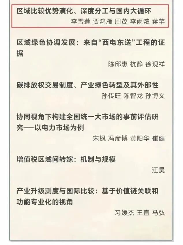 据西南财经大学研究生教育官方公众号显示,该校国际商学院国际贸易学专业2023级博士生贾鸿雁和经济学院李雪莲教授、国际商学院周茂教授、李雨浓教授(通讯作者)、国际贸易学专业2021级博士生蒋芊(毕业后就职于广西民族大学)共同撰写的论文《区域比较优势演化、深度分工与国内大循环》在《经济研究》2025年第6期刊出。