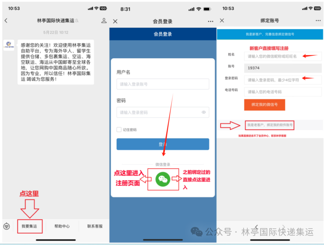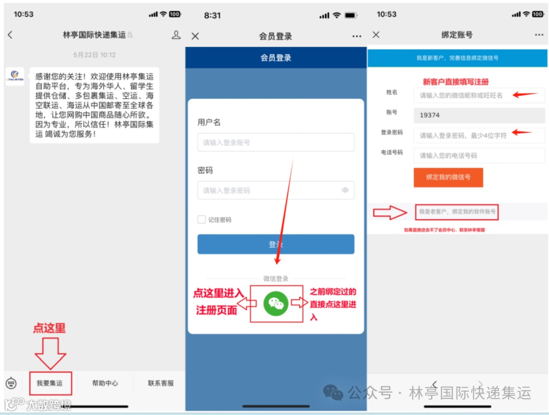 2、点击左下角【我要集运】-进入会员登陆页面-点下方微信图标;新客户填写资料注册会员名; 老客户直接登陆进会员中心。