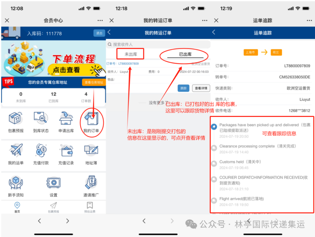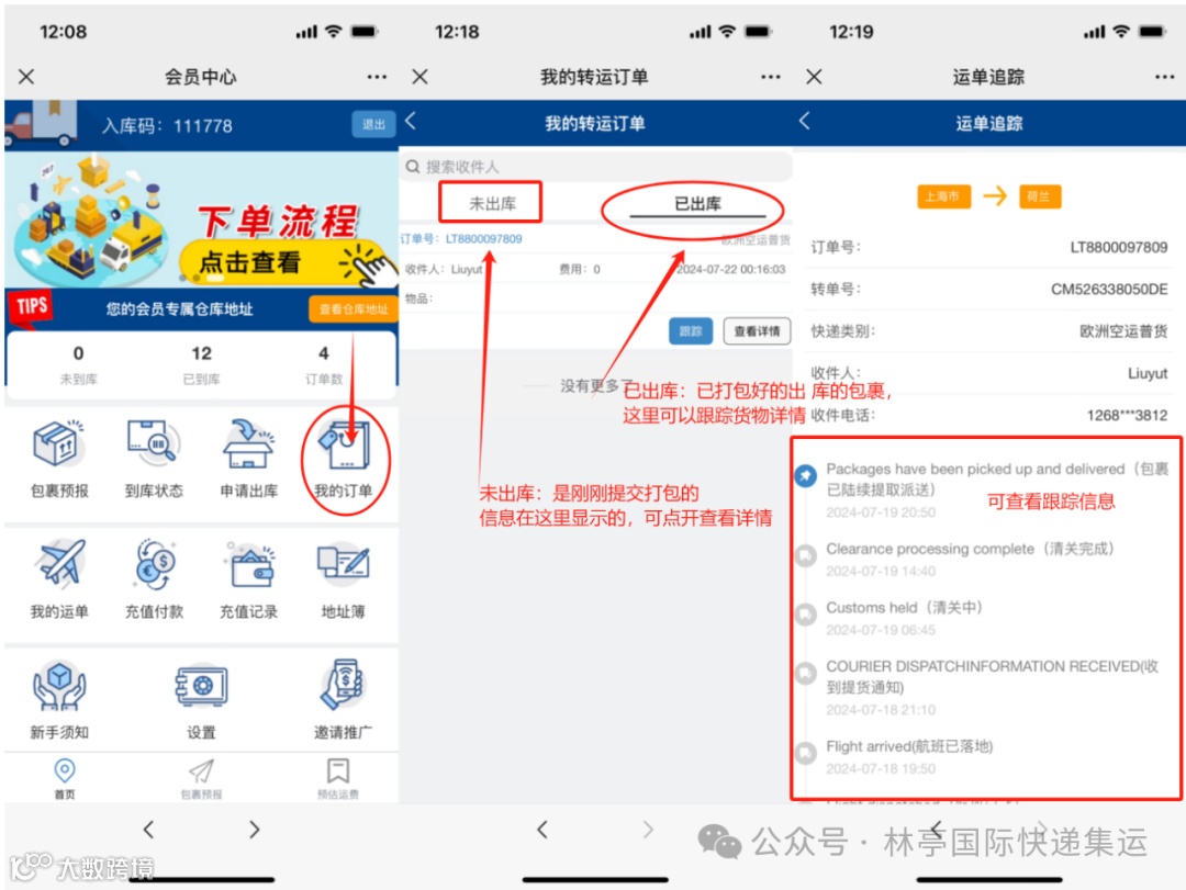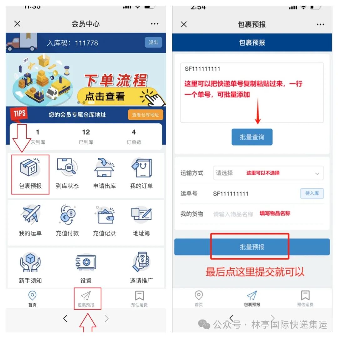 1、从购买商家处下好单后,把快递单号填写在【包裹预报】栏里,如有空最好提前做好预报记录;不做预报也可以,我们仓库到库直接按名称或编号直接扫描入库了。(最好提前做预报以防面单上面不显示或隐藏了收货人名,这样的快递就直接录入无人领取里了)