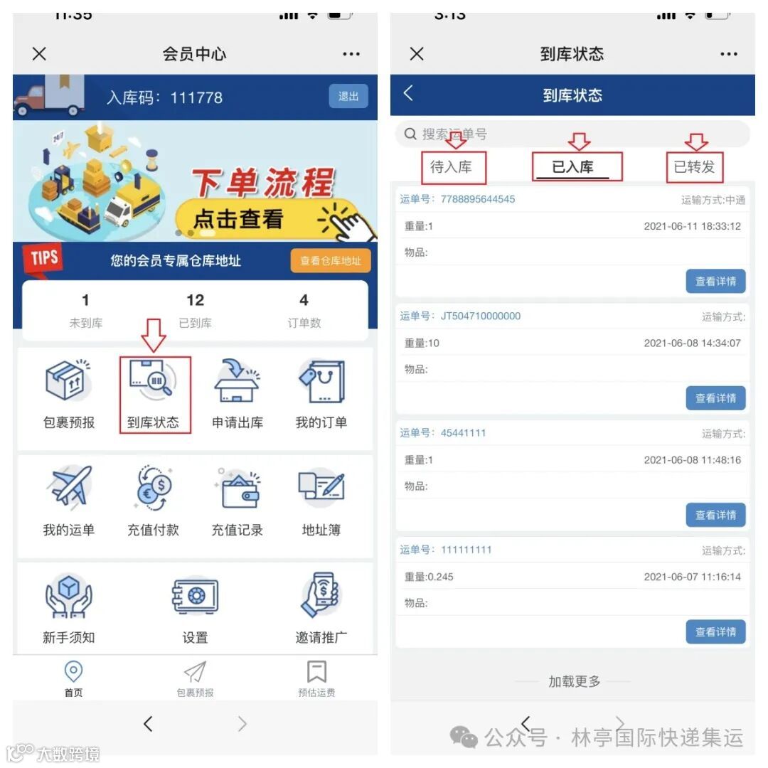 【已入库】可以查看已到我司仓库的快递记录未拆包前重量,点击查看详情可查看快递照片。