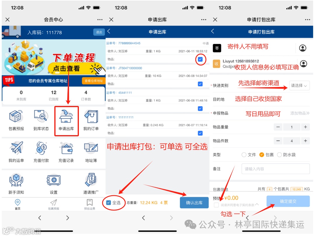 【申请出库】显示到库快递列表,把需要的打包的勾选提交,点确认出库, 填写收货人地址信息,选择邮寄渠道、目的地, 申报物品统一可写:日用品,勾选提交即可,提交后,仓库会按您提交的订单指令配货打包,正常工作时间1~8小时内完成打包(节假日延后)。