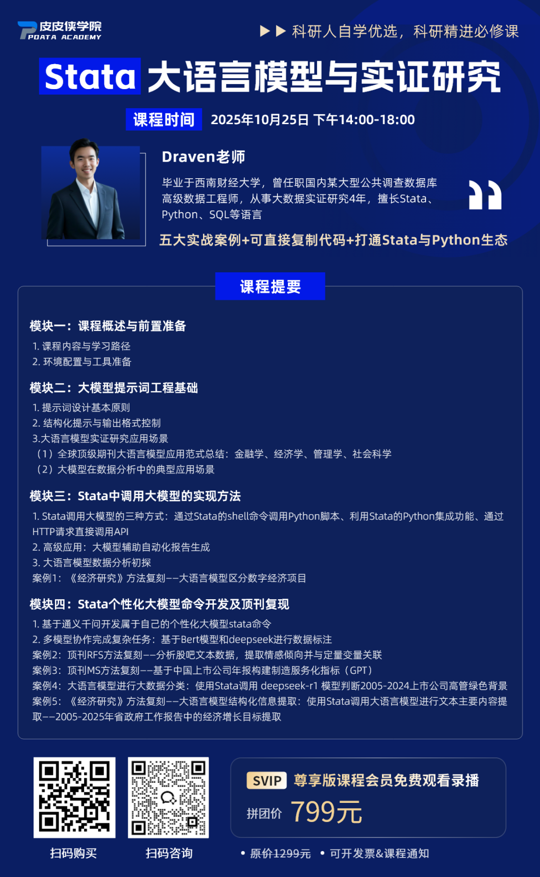 “数智时代”加速到来,经济社会运行数据可被广泛储存、采集和挖掘,以ChatGPT、DeepSeek等为代表的大语言模型(LLM)不断涌现迭代,掀起实证研究变革,我们开发全网首个系统的Stata大语言模型与实证研究课程,助力学者科研精进!