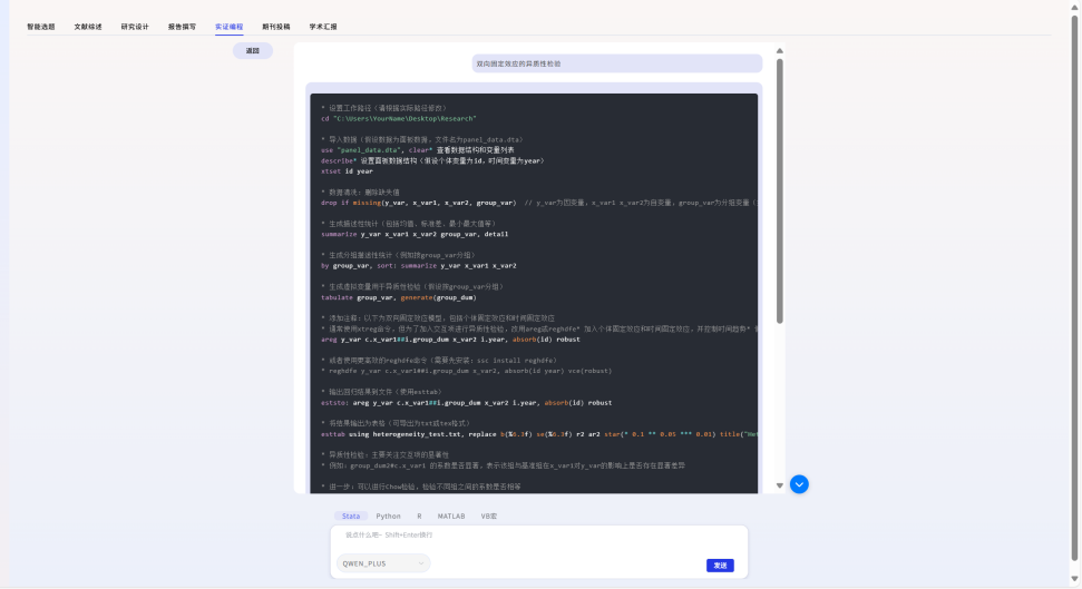 自动生成Stata、Python、R等代码,涵盖数据处理、统计分析与可视化,提升实证研究效率。