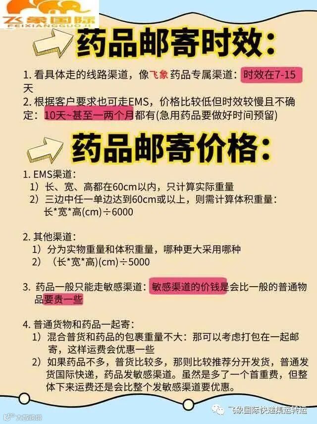 飞象国际提醒您:所有邮寄到国外的药品都必须是国内合法的药品,西药片、中药、胶囊、草药、中药、丸药等都可以邮寄到国外,正规厂家生产的药品,特别是西药片和胶囊需要正规药品的工厂包装,在一些医院等自制的药丸等也可以邮寄,发货时需提供实名认证。