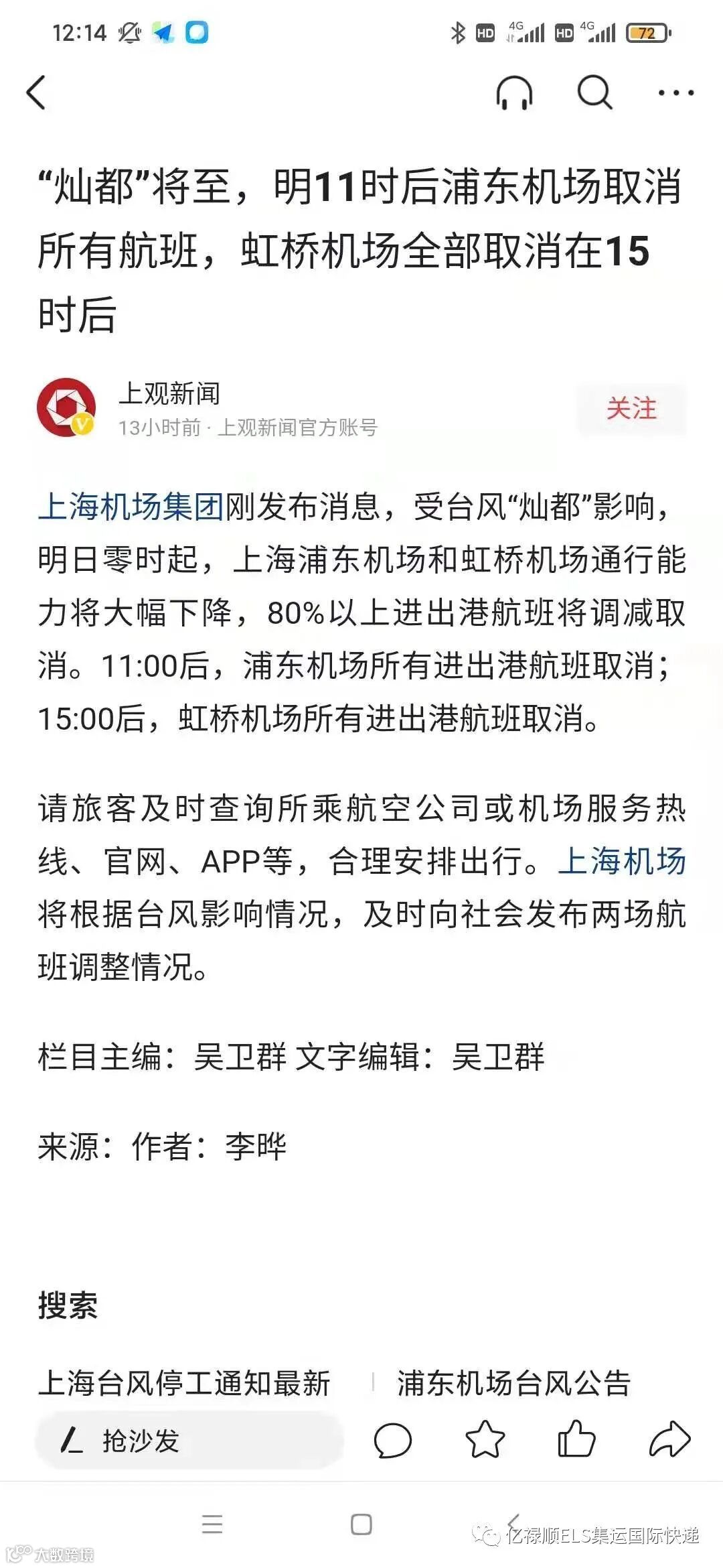 导读:尊敬的客户:由于台风影响,周一(9月13日),周二将上海及周边大面积取消航班,国际包裹转运将进一步延误,同时