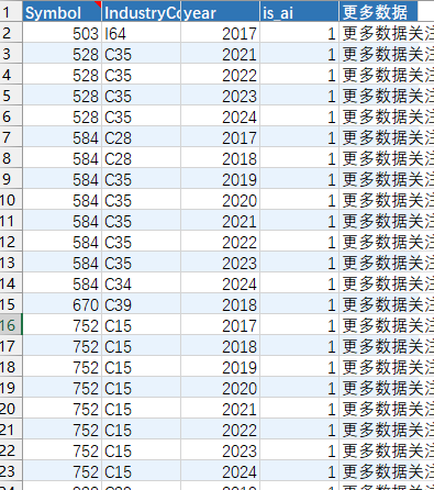 注: Symbol为 股票代码,IndustryCode为行业分类,is_ai为两大模型根据企业经营范围识别的是否为人工智能企业的0-1变量,1表示是人工智能企业,0表示不是。