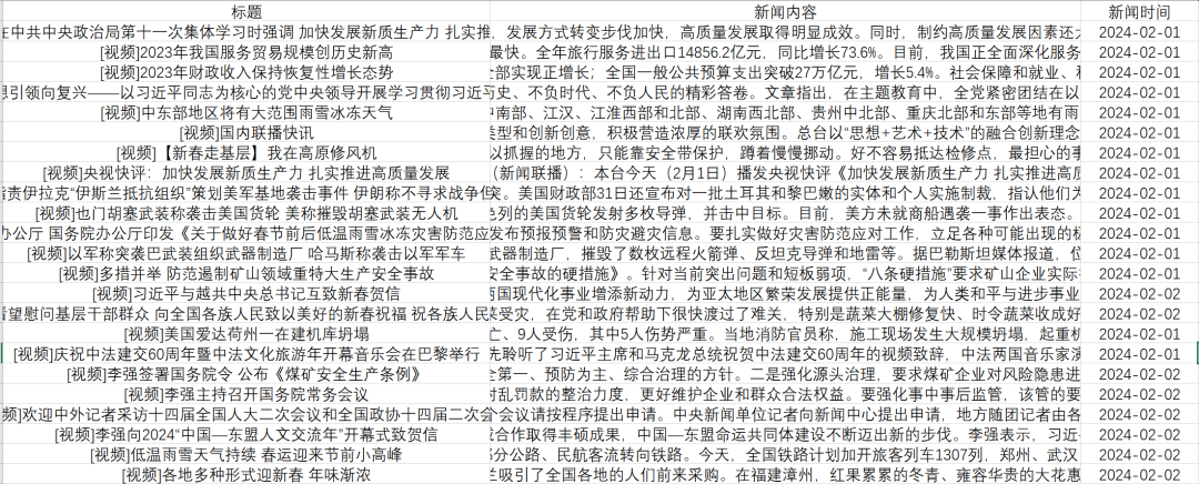 该数据具有多方面的重要价值。从政治层面看,它完整记录了国家政策的发布、解读和推进过程,能够清晰反映不同时期国家战略的调整和重心的转移,为研究中国政治体制运行和政策演变提供了直接的文本依据;从社会层面而言,数据中包含的对社会热点事件、民生问题、群体动态的报道,真实呈现了社会关注焦点的变迁,是剖析社会结构变化和公众需求演变的重要窗口;在文化传播领域,数据展现了官方媒体在不同时期的话语风格、叙事策略和传播方式的调整,为研究媒介传播规律和意识形态建构提供了丰富素材;同时,从历史研究角度,这些连续多年的新闻内容构成了一部鲜活的当代史记录,能够帮助研究者回溯重大事件的发展脉络和社会反应。