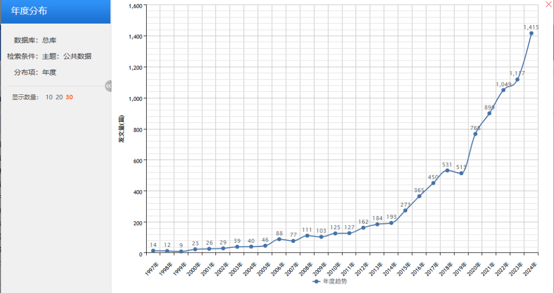 当前数字经济已成为重组全球要素资源的关键力量,我国《“十四五” 数字经济发展规划》明确 2025 年核心产业增加值占 GDP 比重需达 10%,而在2024 年该比重已实现,这体现了数字经济对经济增长的支撑力,所以研究城市数字经济发展的意义十分重大:城市既是数字基建枢纽,也是是产业数字化转型载体。而数据作为数字经济中最重要的组成部分,其获得的难易程度以及质量高低直接决定了城市数字经济的发展。为了扩大公共数据资源供给,降低市场和社会主体获取公共数据的门槛,2015年国务院发布了《促进大数据发展行动纲要》,明确要求到2018年底建立国家政府数据统一开放平台,将政府各部门掌握的数据在该平台上进行统一公开。可以说该平台的建设好坏能够极大程度影响到当地的数字经济发展,因此想要研究城市或区域数字经济发展趋势,可以从公共数据平台建设情况作为切入点进行展开。根据知网的发文趋势也能看出,以公共数据作为切入点的文章数量正在逐年增多,说明这一切入点正在逐渐成为学界共识。