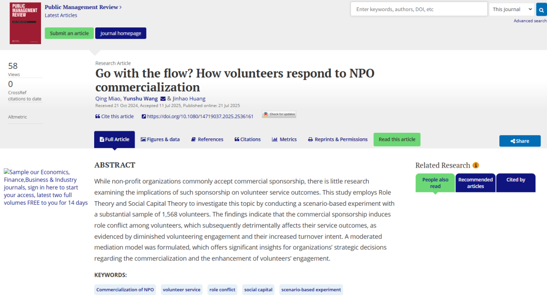 Miao, Q., Wang, Y., & Huang, J. (2025). Go with the flow? How volunteers respond to NPO commercialization. Public Management Review, 1–35. https://doi.org/10.1080/14719037.2025.2536161