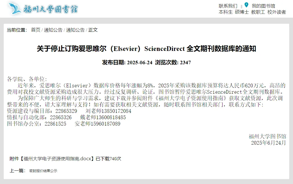 公告称,“近年来,爱思唯尔数据库价格每年涨幅为 8%,2025 年采购该数据库预算将达人民币 620 万元,高昂的费用对福州大学文献资源采购造成很大压力,经过反复调研、论证,图书馆暂停爱思唯尔ScienceDirect全文期刊数据库。