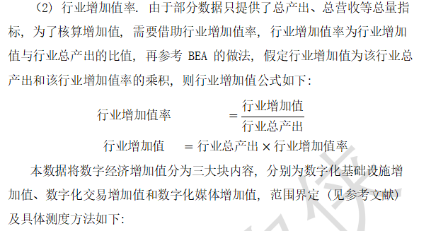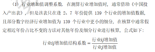 本文测算具体可分为以下几步: 第一, 参考 BEA 和 OECD 的分类方法, 从各地区的《投入产出表》中直接获取属于数字经济范畴的全部行业增加值; 第二, 对于同时包含数字经济与非数字经济内容的行业, 需要借助更详细的《经济普查年鉴》进行拆分, 提取属于数字经济部分的增加值; 第三, 将各部分增加值相加, 即可得出数字经济增加值总量. 由于测度数字经济增加值的过程中多次涉及增加值、总产出、营收等不同的测度指标, 又受限于现有的官方统计资料, 测算工作存在一定困难. 例如,《投入产出表》仅在逢 2、逢 7 年提供延长表, 各省《经济普查年鉴》只在逢 3、逢 8 年提供调查数据. 此外, 现有资料中, 部分指标采用增加值核算方法, 部分指标则采用总产出核算方法. 因此, 在测算各年份数字经济增加值时, 通常需要借助调整系数, 最为常用的调整系数有以下两种: