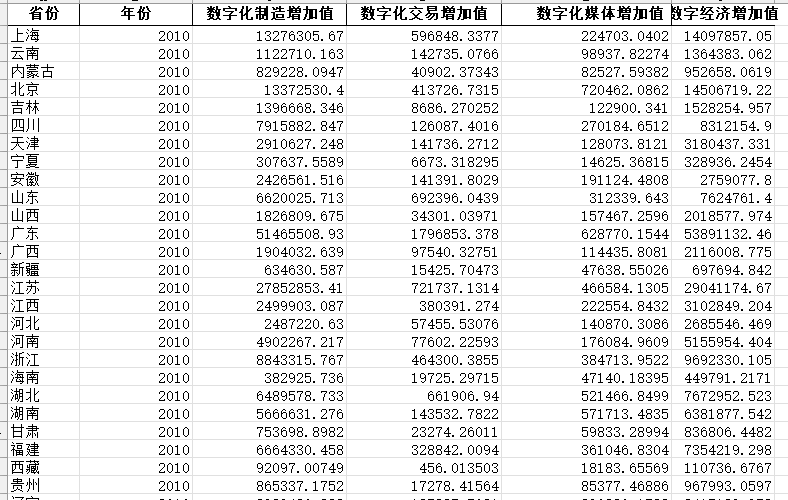 数字经济作为互联网时代背景下高速发展的经济与现代化信息技术深度融合的产物, 近年来得以迅速发展, 深刻地影响着生产与生活的方方面面。. 鉴于我国地区差异, 测算省级层面的数字经济增加值尤为重要, 这不仅有助于深入了解数字经济发展特征, 也为后续探究数字经济发展对城乡收入差距的影响提供了重要基础. 基于以上背景,本数据对中国31省数字经济增加值进行测算。