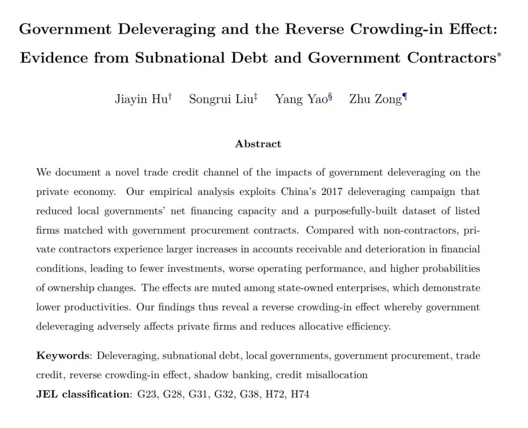 该研究以中国2017年去杠杆政策为自然实验,系统考察了地方政府债务风险防范对企业部门的传导机制,揭示了政府去杠杆通过贸易信贷(trade credit)渠道影响实体经济尤其是民营企业的逆向挤入机制,为理解化债政策的复杂性提供了新的理论视角和实证证据。