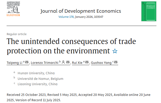 Li, Taipeng, et al. "The unintended consequences of trade protection on the environment." Journal of Development Economics (2025): 103547.