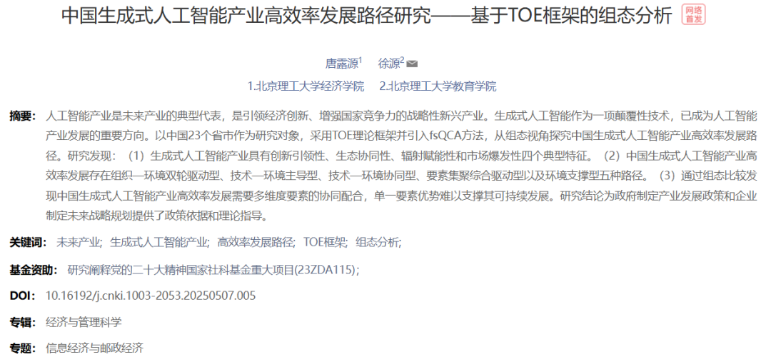 唐露源,徐源.中国生成式人工智能产业高效率发展路径研究——基于TOE框架的组态分析[J].科学学研究,2025.