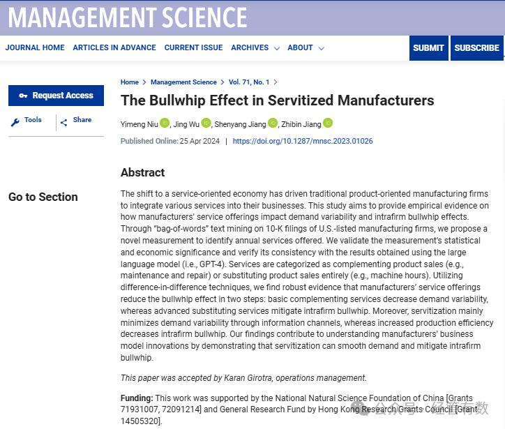 上海交通大学安泰经济与管理学院管科系江志斌教授(共同通讯作者)、牛艺萌(第一作者、江志斌教授博士生)与合作者Jing Wu, Shenyang Jiang在管理科学类国际顶级期刊 Management Science 上发表学术论文“The Bullwhip Effect in Servitized Manufacturers”,这项研究探索了大语言模型(GPT)在识别10-K报告中有关制造业企业服务化信息的能力,为大语言模型在学术研究中的应用提供重要参考价值。