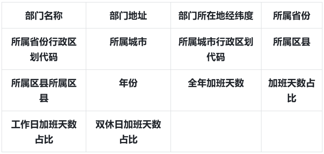 将国务院各组成部门(排除国安部)在全国所有层级政府相对应职能的部部门单位的加班情况汇聚在一起,时间从2012年到2024年,分日度和年度数据!
