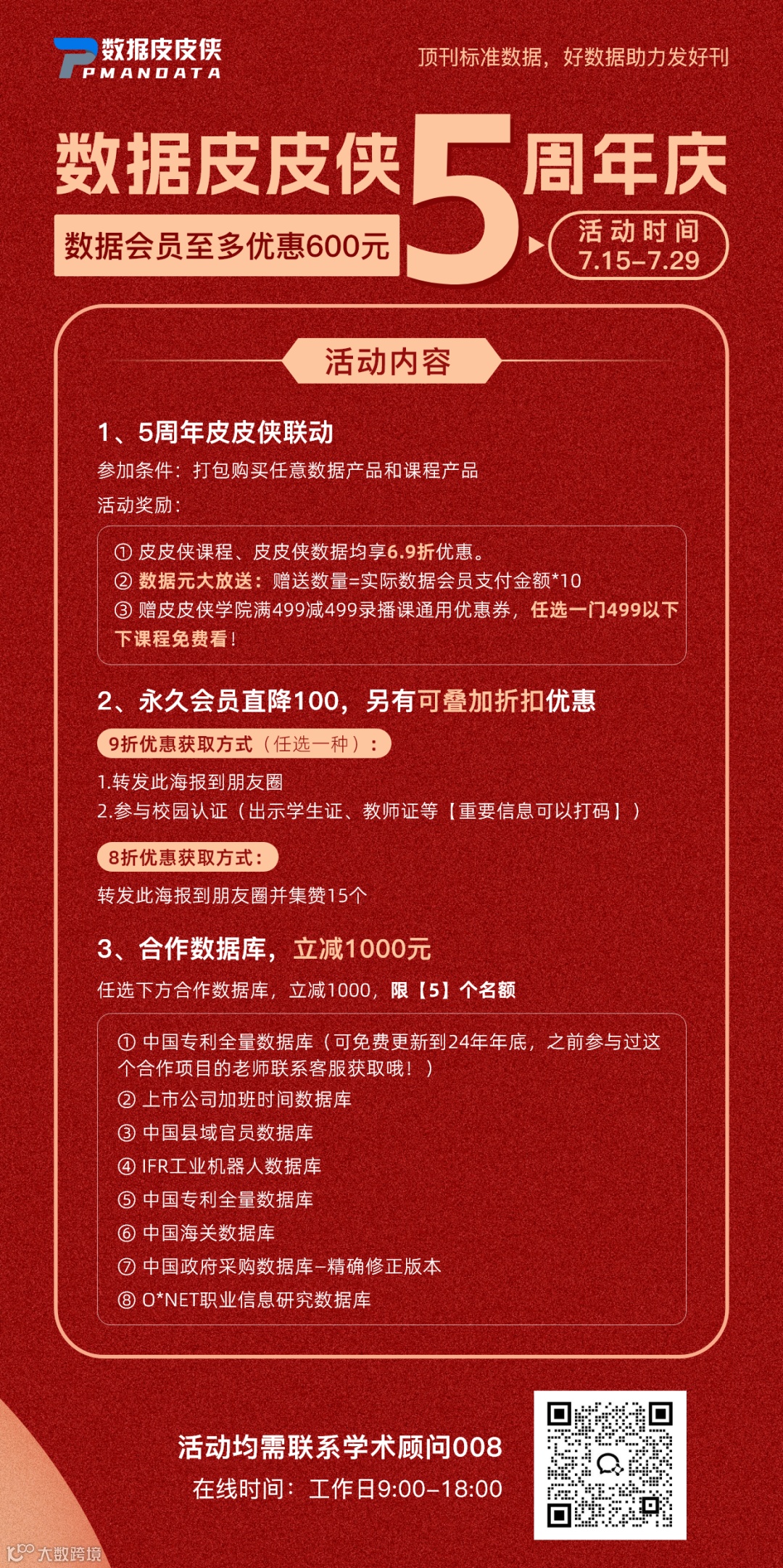 顶刊标准数据,好数据助力发好刊!5周年优惠活动火热进行中!期间永久会员直降100!数据会员至多优惠600元!