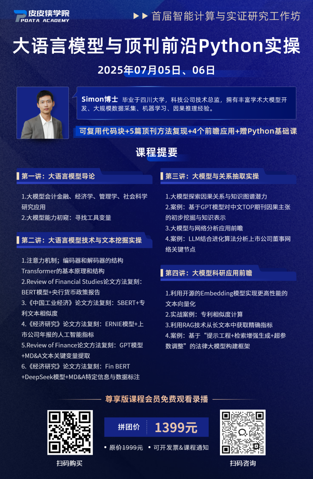 课程时间:2025年7月5日-7月6日 上午10:00-12:00,下午15:00-17:00(可能视情况加时)