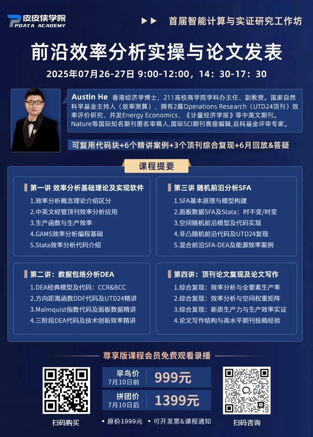 皮皮侠学院重磅直播课程《前沿效率分析实操与论文发表》火热报名中!课程由UTD24顶刊作者亲授,聚焦数据包络分析(DEA)、随机前沿分析(SFA)等核心方法,通过6大顶刊案例精讲与3大综合项目复现,覆盖生产、能源、科技与绿色效率等前沿领域。