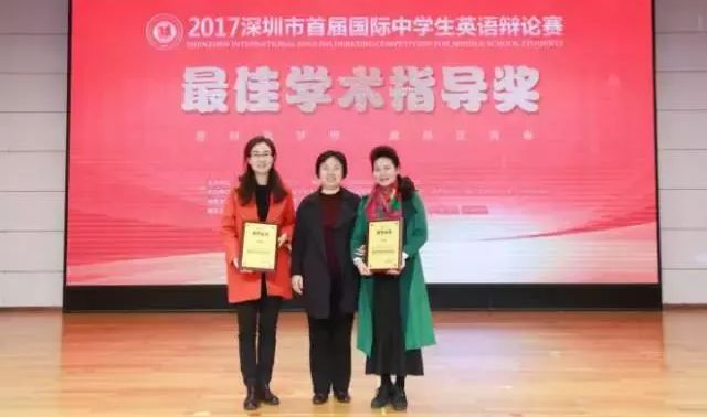 深圳市教科院副院长李桂娟女士为获得最佳学术指导奖的深圳市教科院英语教研员李睿和福田区英语教研员廖春风颁奖