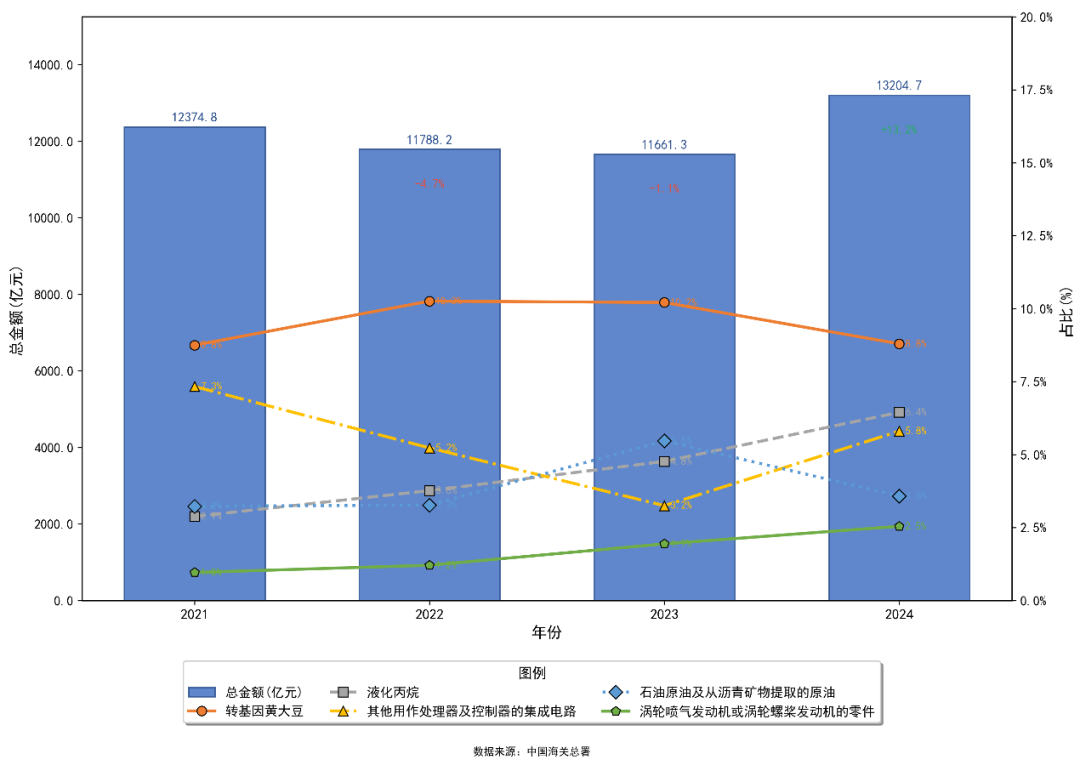 2021-2024年美国对华出口总金额及主要商品占比变化