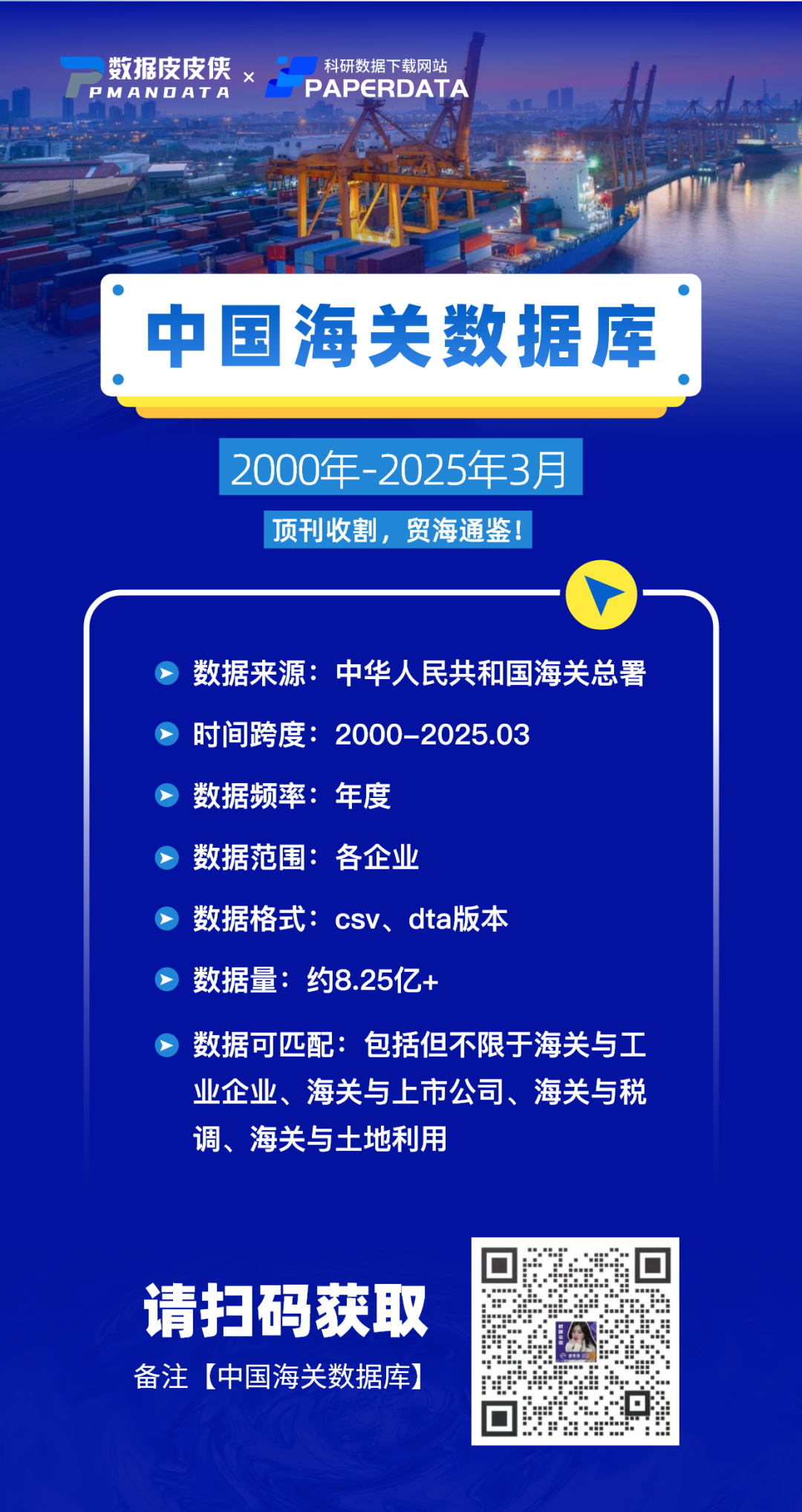 海关数据作为经管研究的香饽饽,皮皮侠团队收到无数这个数据的需求,为满足学者们的科研需求,数据皮皮侠团队携手PAPERDATA数据团队开发了中国海关数据库(2000-2025)。