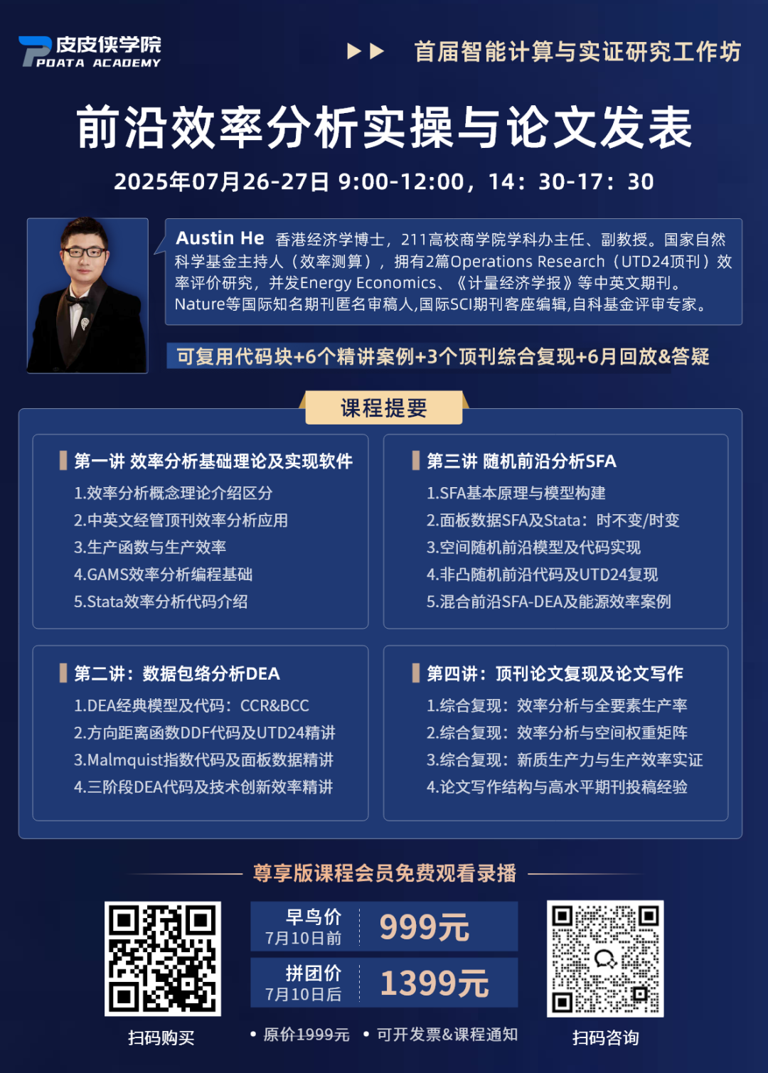 本课程系统性介绍经典以及新兴前沿效率模型,剖析其经管应用——既可作主体模型也可用于测量核心变量。同时介绍目前最火热的数据包络分析(DEA)和随机前沿分析(SFA)的理论与论文方法实操,帮助学者运用Stata、GAMS实现效率分析,拓展研究视野。我们将通过6个论文案例精讲,3个顶刊综合复现案例,帮助学者灵活运用效率分析。同时将分享领域高水平论文发表与投稿经验,主讲老师发表多篇UTD24顶刊论文,在QS前30高校拥有广泛的学术合作网络,欢迎有志于科研精进的学者前来1V1深度交流。