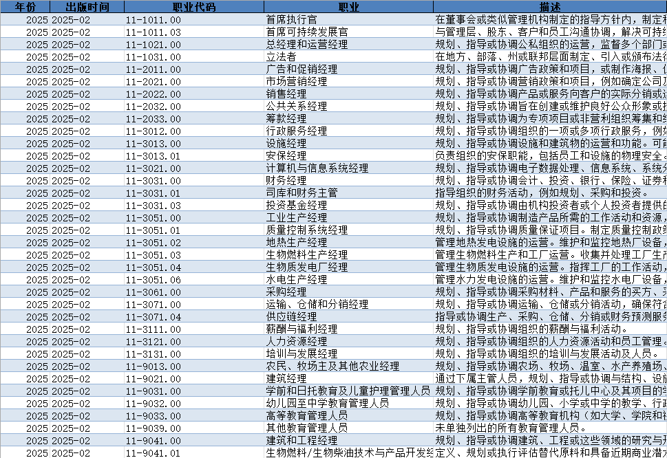 数据范围:近1000多个职业,六种分类体系:职业聚类、职业子聚类、行业、职位族、STEM 职业类型、前景光明的职业的类别