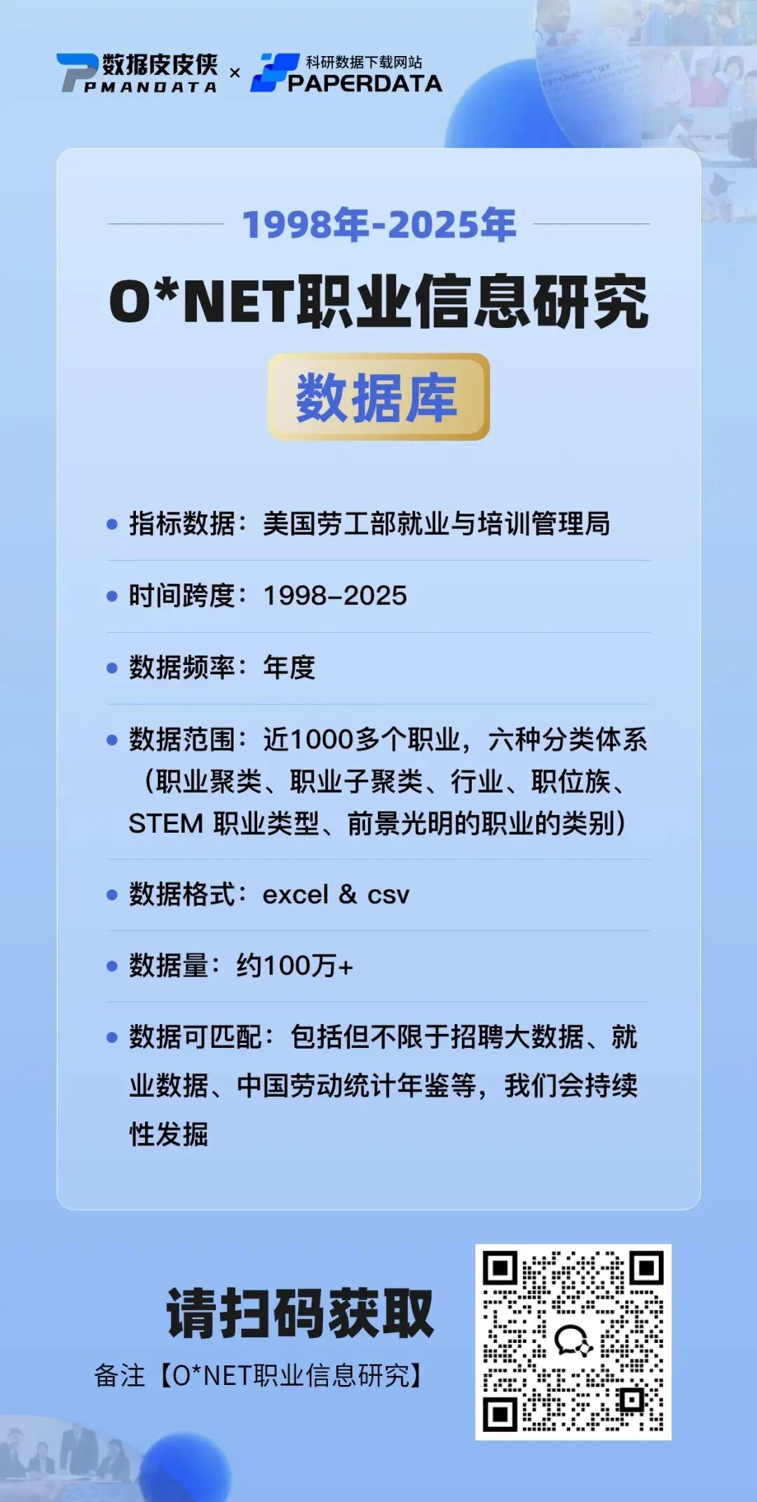 在经学者专家们对反映有关科研需求后,数据皮皮侠团队和PAPERDATA数据团队一起引入并整理开发了O*NET美国职业信息网络数据库。