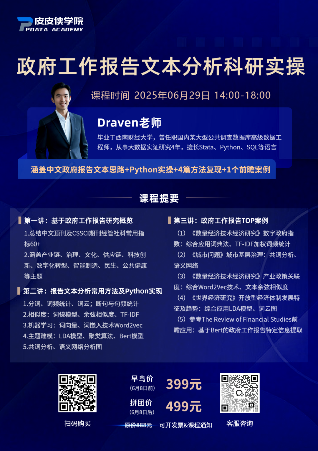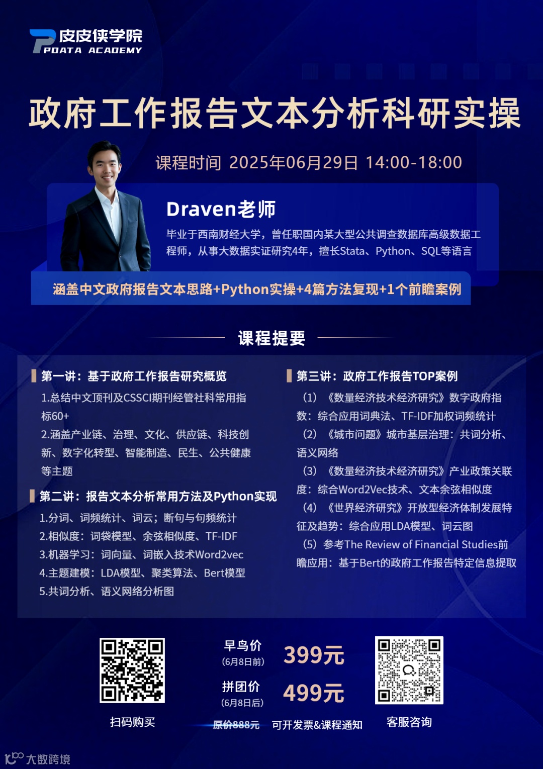 本课程系面向经管人文社科研究人员的前沿方法课程,聚焦基于政府工作报告典型应用场景的指标测算,旨在打破政府工作报告文本挖掘的壁垒,从国务院&省政府工作报告全量文本→政府工作报告用途→文本分析方法→数据处理→顶刊政府工作报告指标复刻全流程打通,助力科研发表!